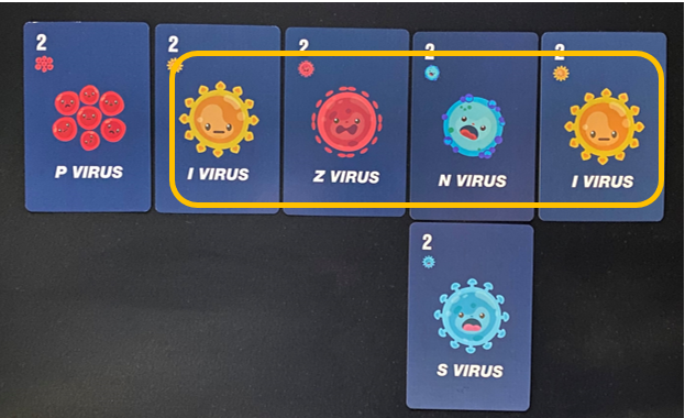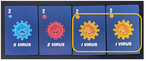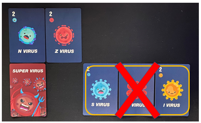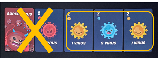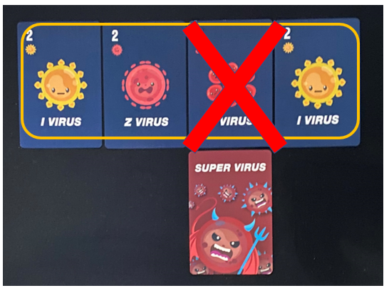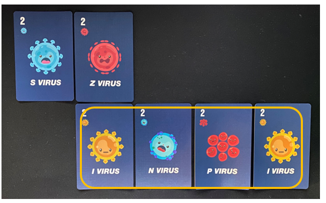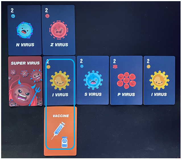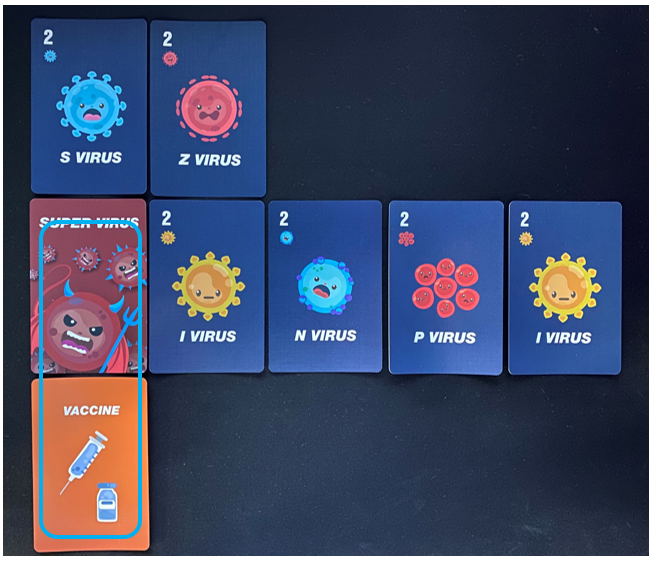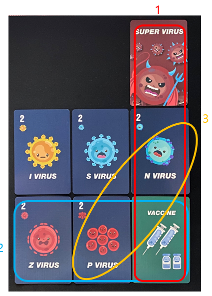 5. 슈퍼 바이러스는 맞닿아 있는 모든 카드를 보호하고, 백신1은 한개에 바이러스를 백신 2는 두개의 바이러스를 치료하여 가져오게 합니다. (슈퍼 바이러스에 맞닿아 있다면 카드는 가져오지 못합니다.)