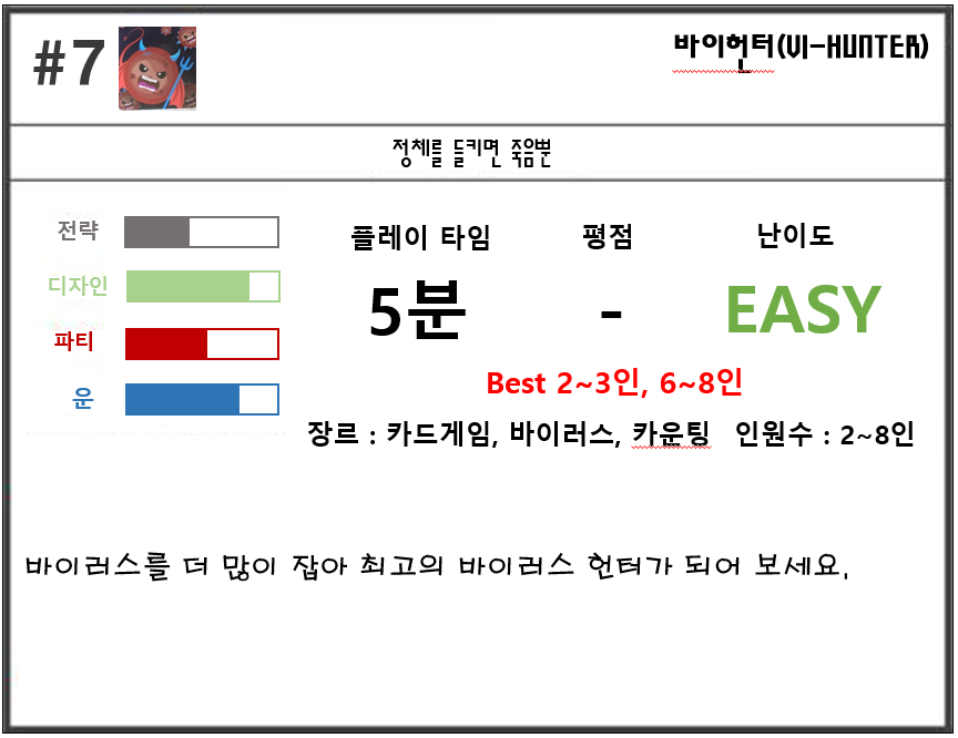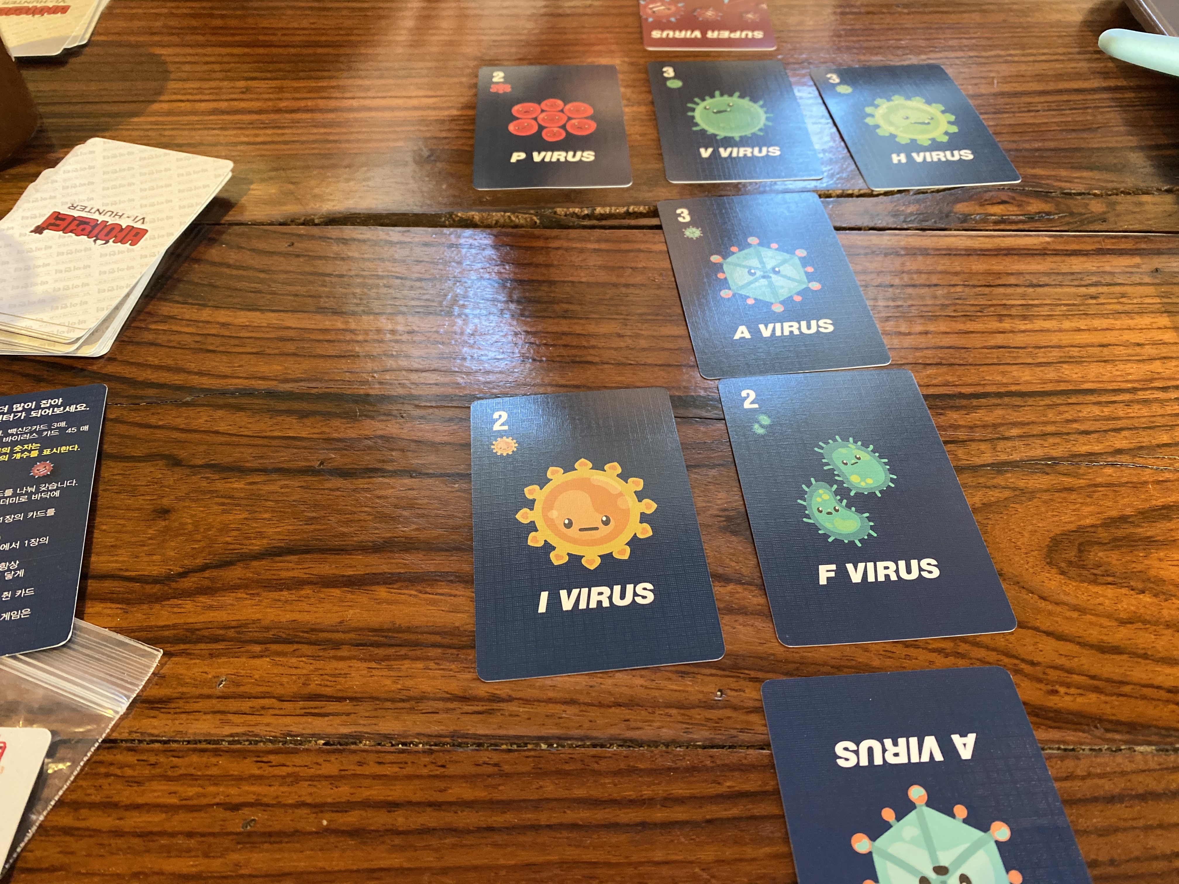 규칙을 봤을때는 카드를 카운팅 해가면서 상대방을 견제할 줄 알았지만, 실제로 플레이 했을때는 카운팅은 커녕 슈퍼바이러스로 상대방 방해하면서 놀리고, 백신으로 치료하면서 가져가고, 나오는 카드를 보고 바로 전략을 짜는 식으로 플레이하게 됩니다. 카운팅을 정말 노력해서 해봤자 특수카드들로 방해를 받아 다 소용없게 됩니다.