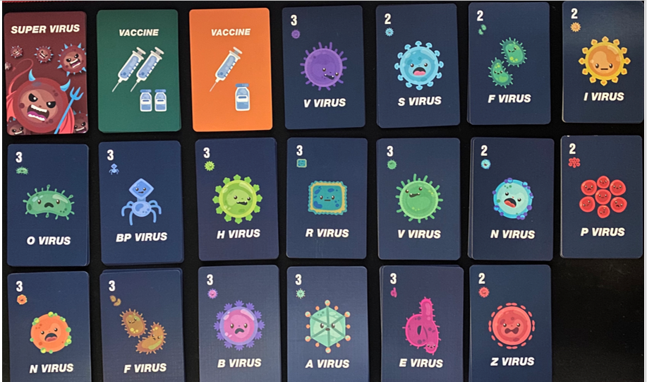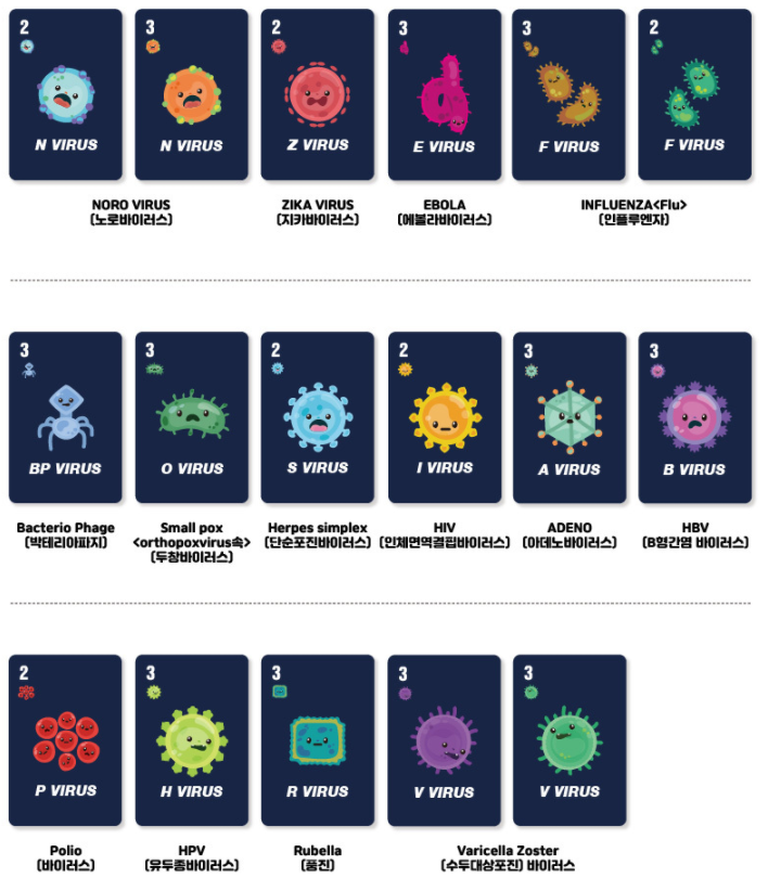 백신 1 카드 3장, 백신 2 카드 3장, 슈퍼 바이러스 카드 5장, 바이러스 카드 45장
