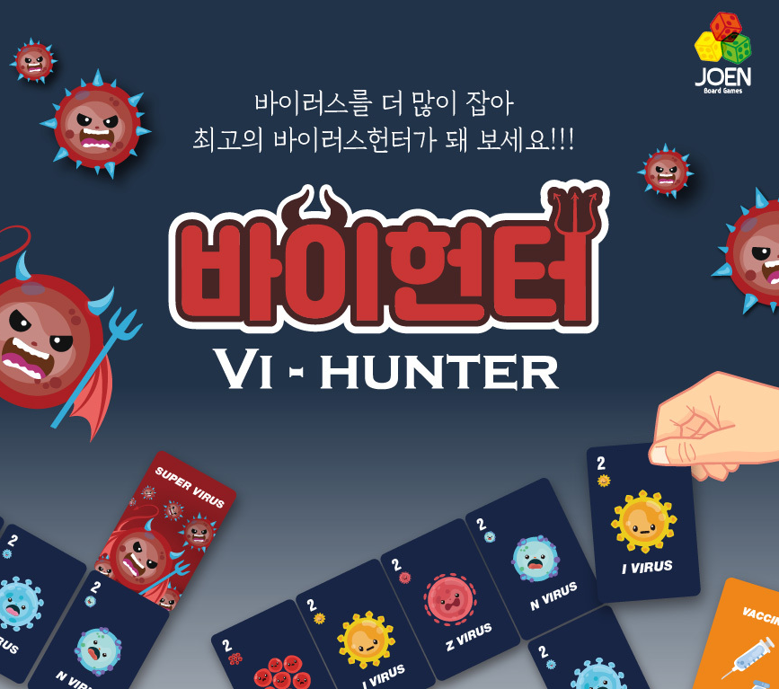 보드게임 바이헌터는 실제 바이러스를 모티브로 디자인되었고, 명칭은 대표 이니셜 한글자로 단순하게 표기하여 누구나 쉽게 즐길 수 있게 만들었습니다.