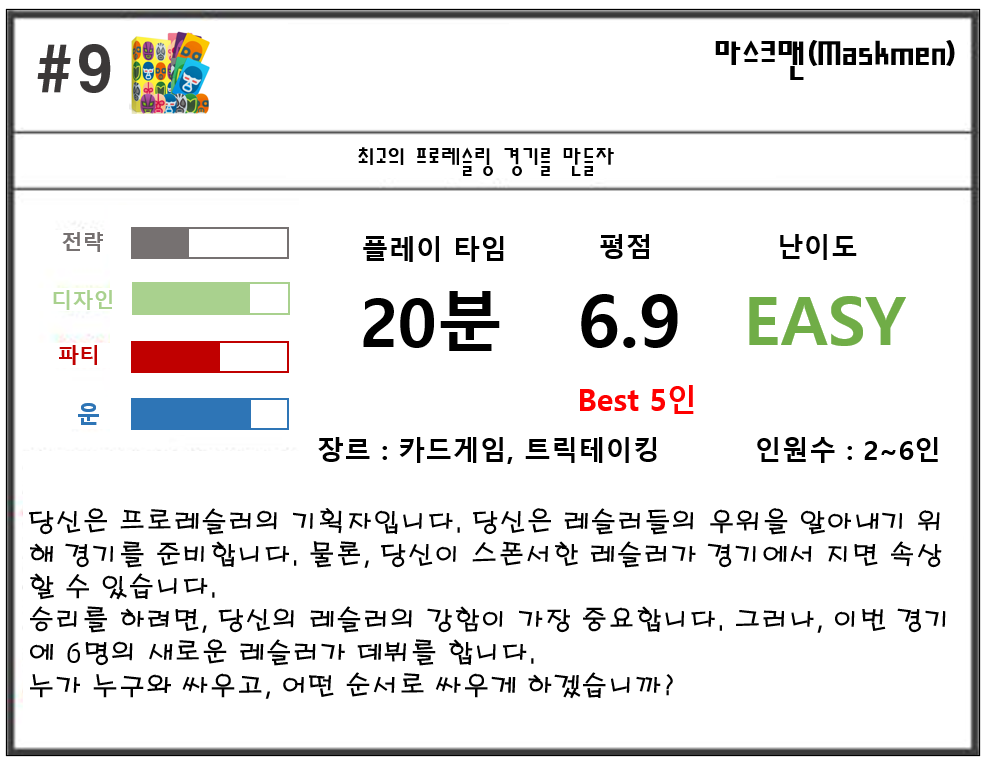 마스크맨은 오잉크 회사에서 제작했으며, 디자인적으로 볼거리가 있는 게임입니다. 링에 출전하는 레슬링 선수들에 의해서 자신의 패가 최강이 되기도 하고, 최약이 되기도 합니다.
