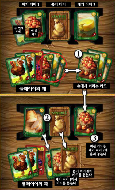 - 뽑기 더미가 바닥나게 되는 상황이 발생하면, 폐기더미 맨 위의 다섯 장씩을 섞고 다시 뽑기더미를 만듭니다.