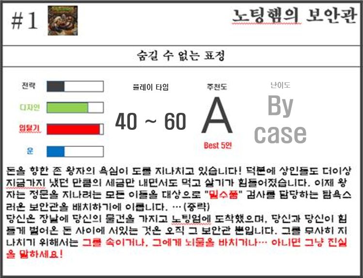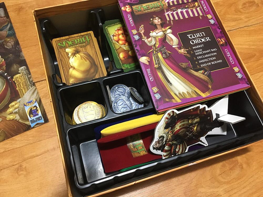 노팅햄의 보안관, 노팅엄의 보안관, 노팅엄의 장관.... 동네마다 이름이 다른건지 여러가지 이름으로 불려지는 이 게임은 이름이 많은 것처럼 플레이어는 가면을 많이 써야 하는 게임입니다. 간단하게 설명하자면 한명씩 보안관을 돌아가면서 진행하고 다른 플레이어들이 밀수품을 몰래 가지고 들어 오는지 감시하여 돈을 최대한 많이 가지고 있는 사람이 이기는 게임입니다.