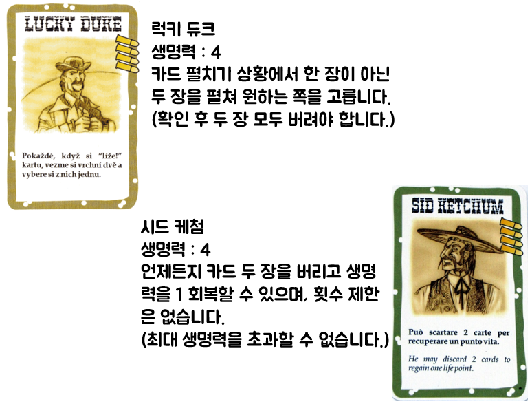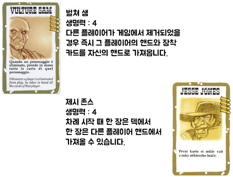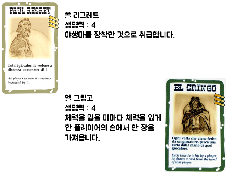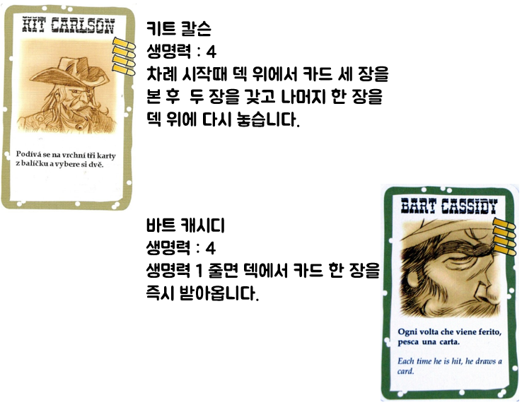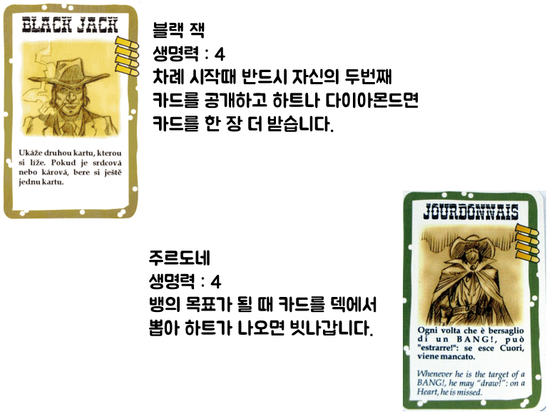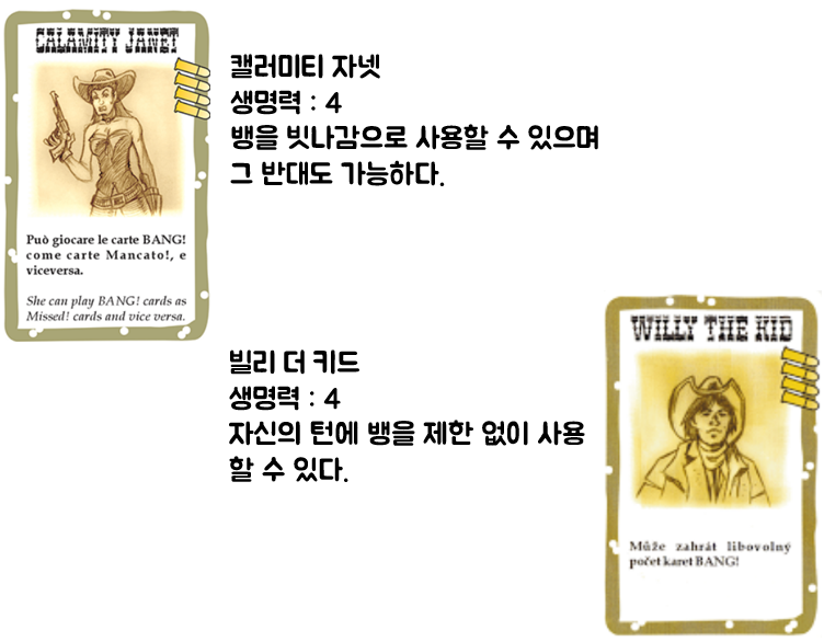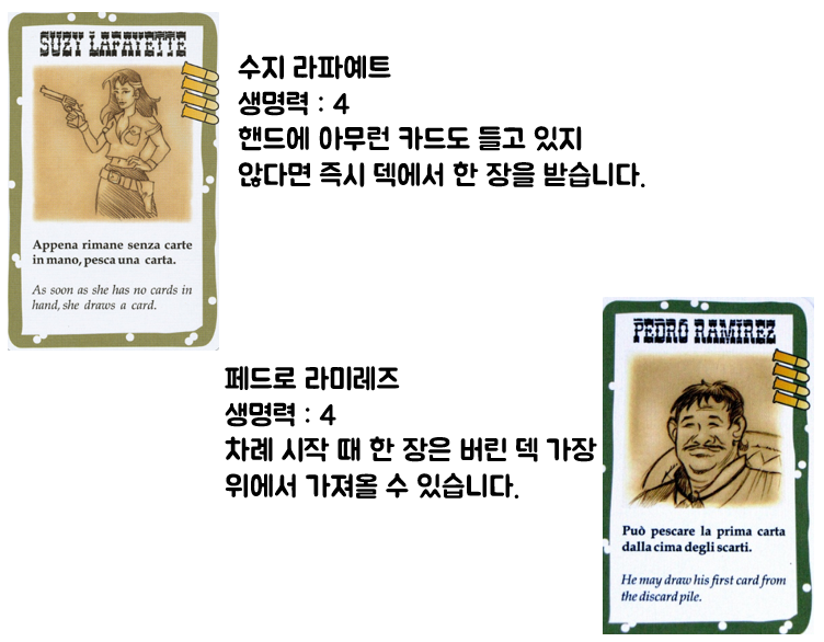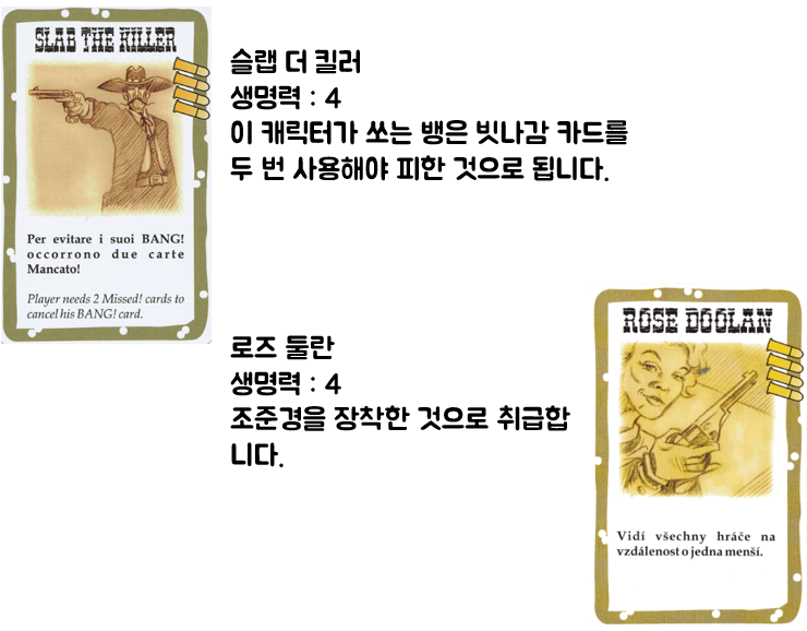 인물 카드 오른쪽 위에 표시가 되어 있는 총알 수가 자신의 생명력이 되고, 각 캐릭터마다 고유의 특수능력이 있습니다.