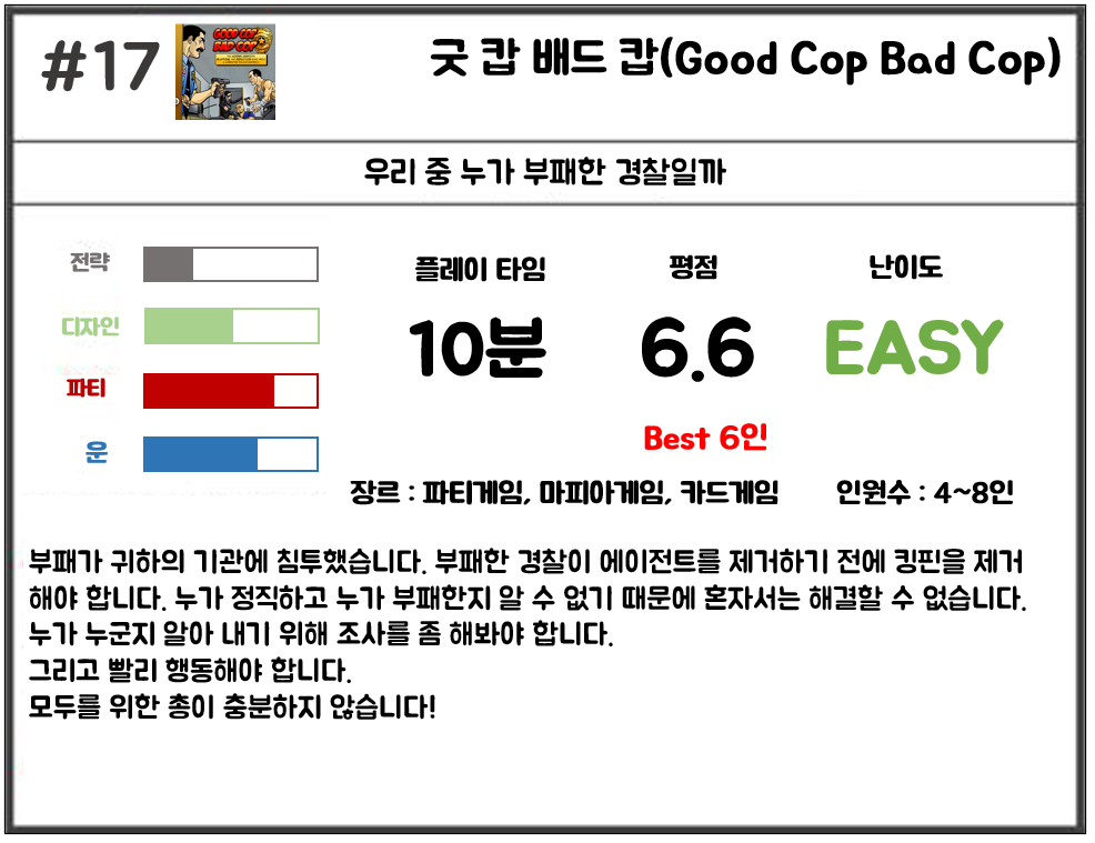 굿 캅 배드 캅은 6인 보드게임 이상으로 추천드리지만, 더 많은 7인 보드게임, 8인 보드게임 이상도 추천드립니다.