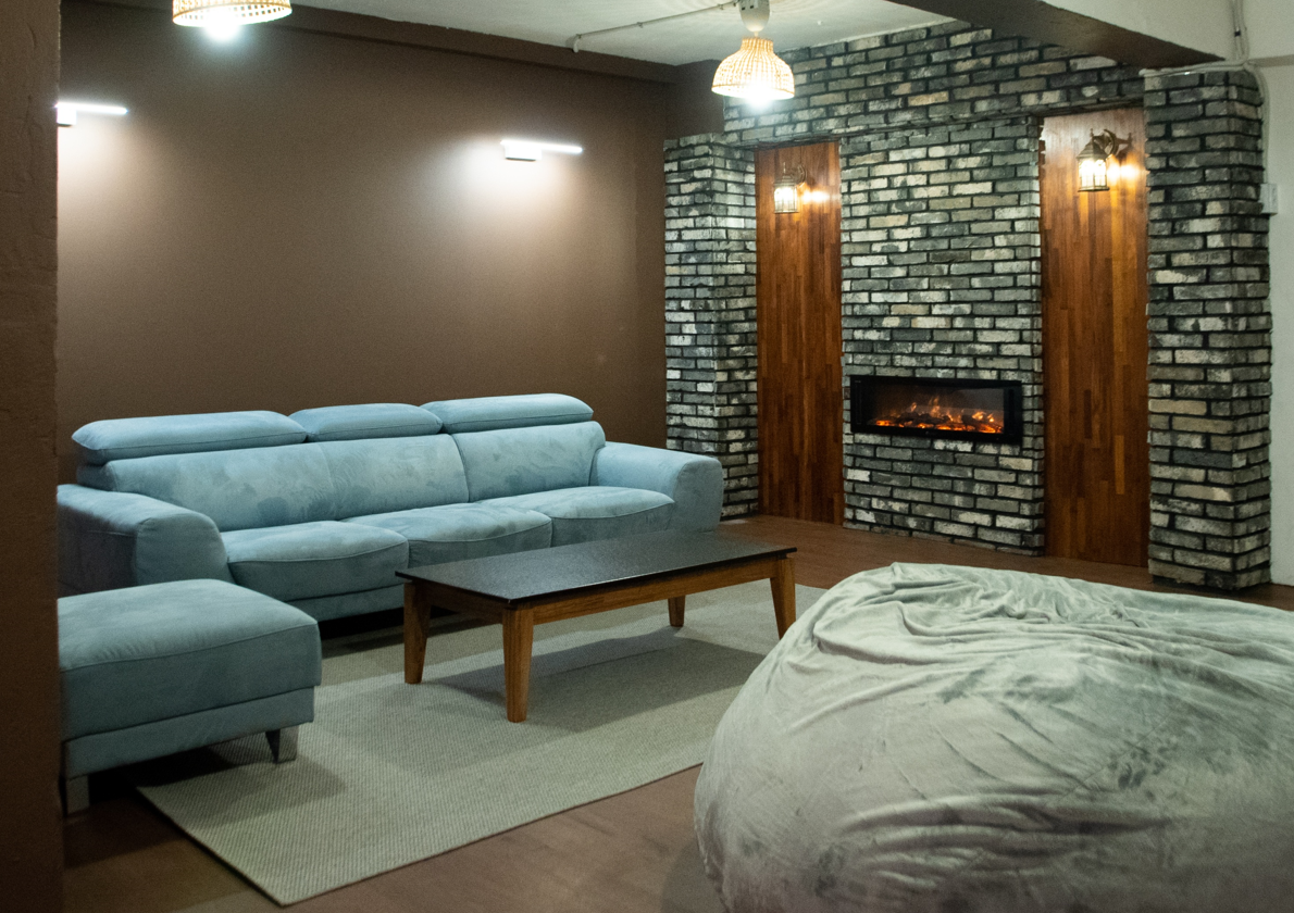 쇼파와 빈백에 앉아서 벽난로 앞에 따뜻한 분위기를 내며 담소를 나눌 수 있는 공간이 존재합니다.