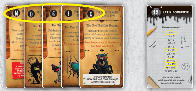 몬스터 카드의 왼쪽 상단의 글자를 챕터 순서대로 놓고, 공책으로 숫자로 변환합니다.