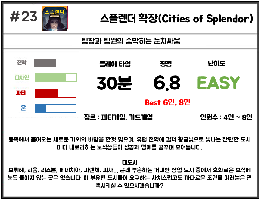 많은 보드게임 입문자들을 좀 더 깊숙한 세계로 시작하게 만드는 스플렌더가 확장판이 있습니다.