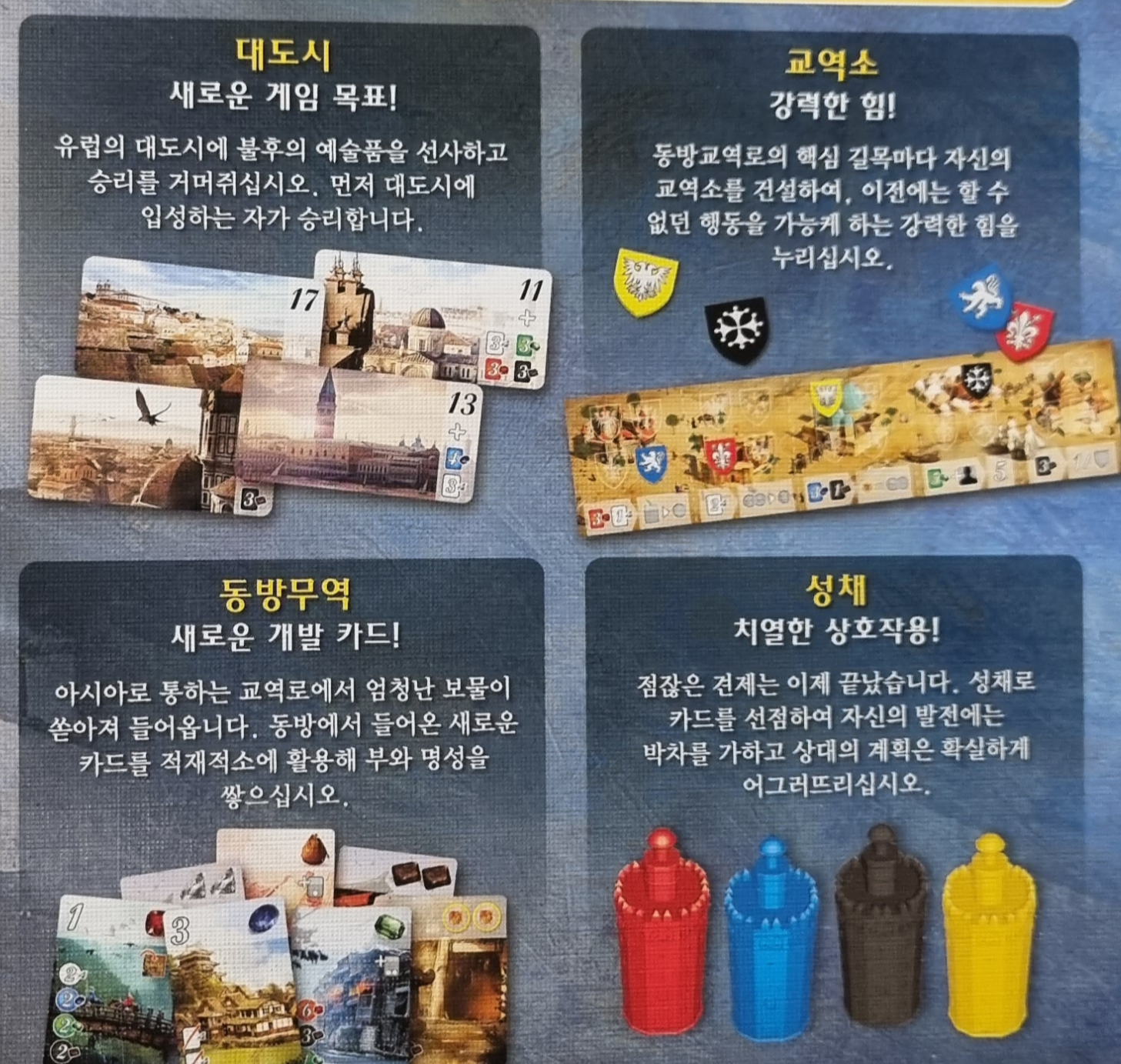 이제는 다양한 전략과 플레이를 위해 확장판에 대도시, 성채, 교역소, 동방무역 4가지가 있습니다.