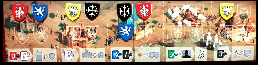 자기 차례를 끝마칠 때(귀족 방문까지 끝난 뒤) 어떤 한 교역소의 조건을 충족했다면, 게임이 끝날 때까지 해당 교역소의 효과를 사용할 수 있습니다(해당 교역소 빈칸에 자기 문장 토큰을 놓아 이를 표시하며, 교역소마다 자기 문장을 하나씩만 놓을 수 있습니다)