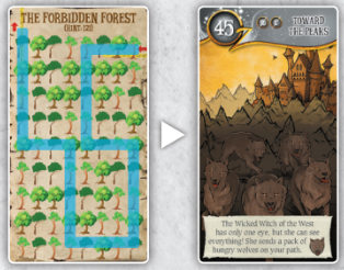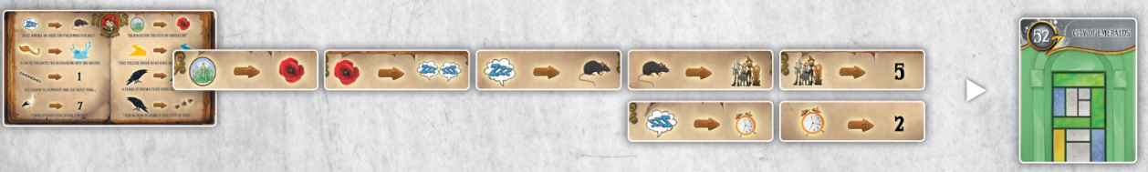 5. 표지판은 여러분이 에메랄드 도시로 가는 길을 따라가도록 초대합니다. 이전과 마찬가지로 캐릭터 카드의 뒷면을 사용하고 경로를 따라갑니다. 52번 카드를 가져가시면 됩니다.