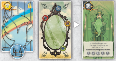 거울 보석의 색깔은 무지개에 있는 것과 같고, 91번 카드에 구멍을 덧씌우면 4개의 숫자가 나타납니다.