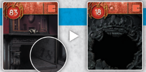 9. 18번 숨겨진 구멍을 찾기 위해 특히 83번 벽난로의 바닥 부분을 철저히 찾아봅니다. 18번 카드를 가져갑니다.