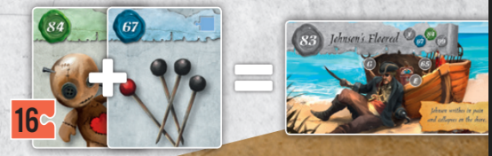 16. 84번 카드 부두인형과 67번 카드 바늘을 이용해 해적을 저지합니다.