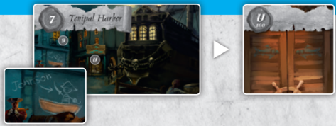 7번 카드의 왼쪽에는 갈색 선체에 보물 사냥꾼을 묘사한 그래피티가 있습니다.