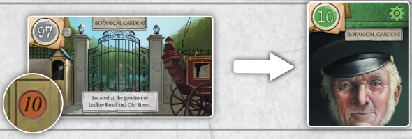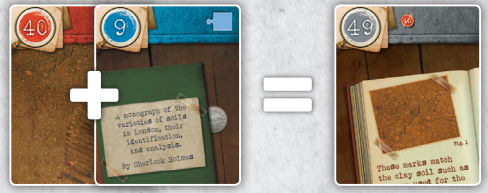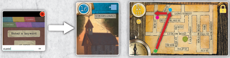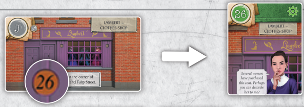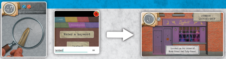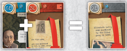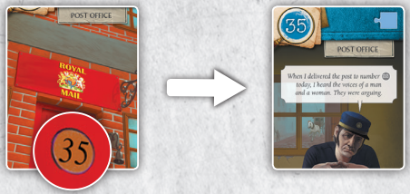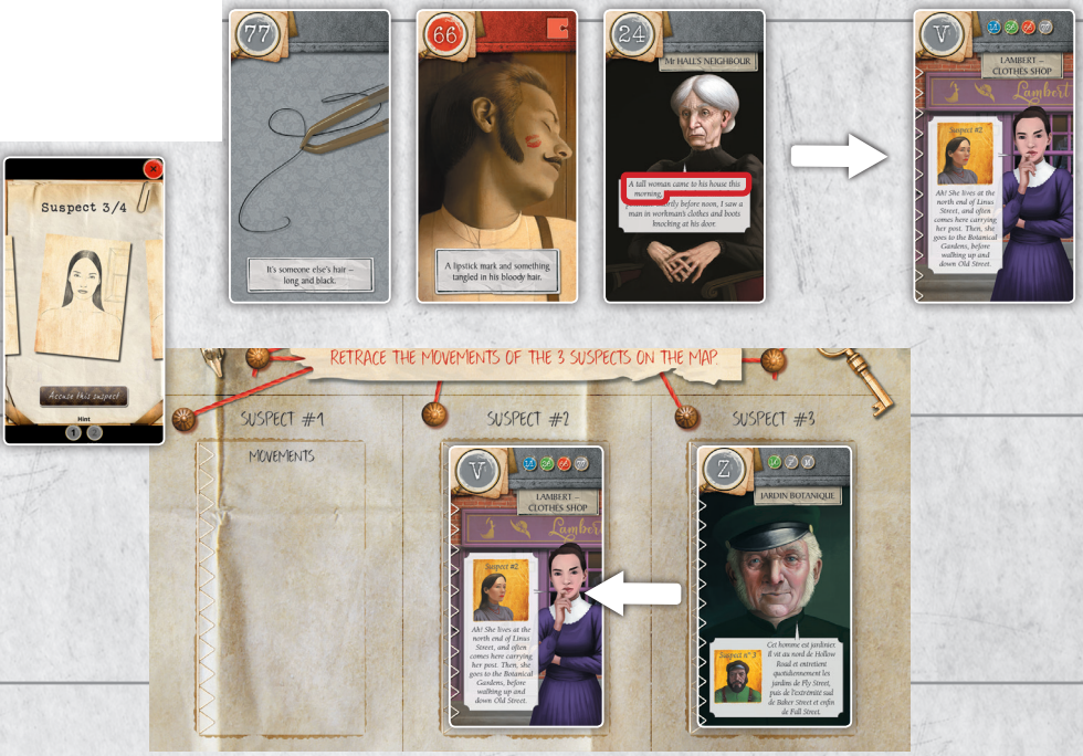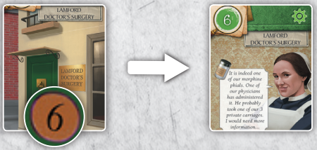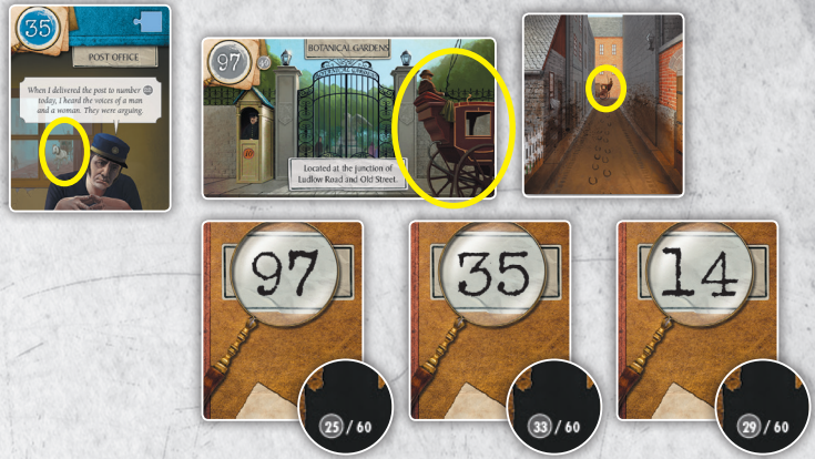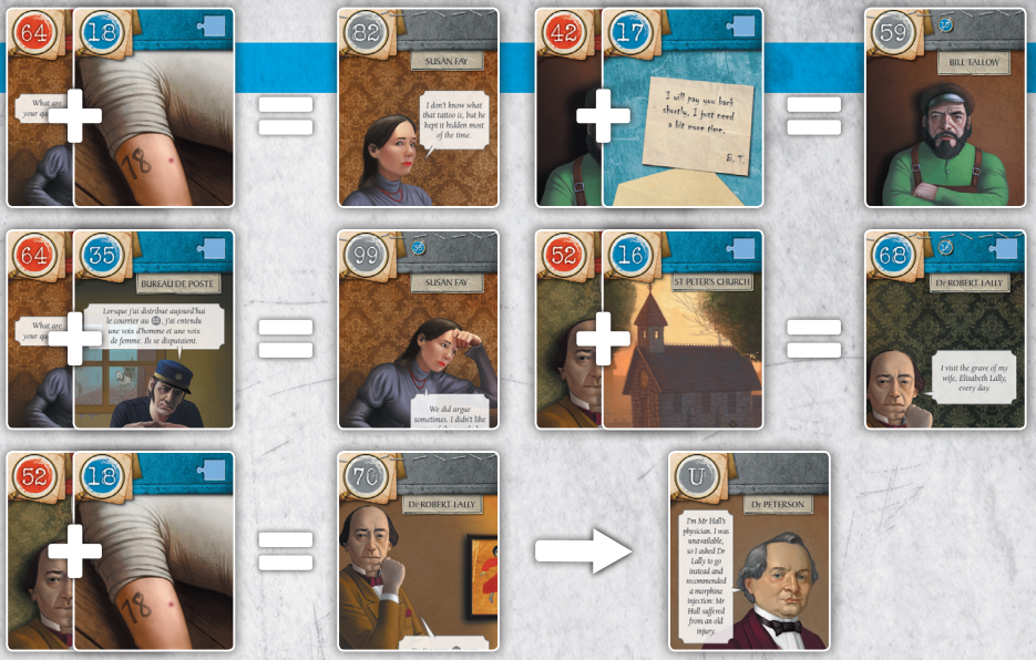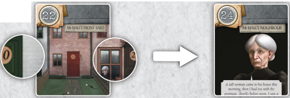 70번 카드(Dr Lally는 아내의 살인자를 살해합니다)는 범죄 현장 앞에 연대순으로 나열되며, 1, 1, 5, 2번의 4개 번호가 빨간색으로 표시됩니다.