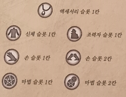 조력자 슬롯 1칸, 신체 슬롯 1칸, 액세서리 슬롯 1칸, 손 슬롯 2칸, 마법 슬롯 2칸