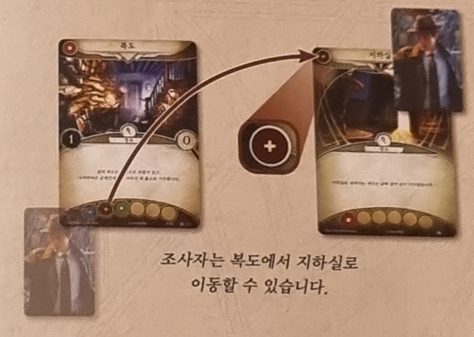 조사자의 인물 카드를 이동하려는 장소에 놓습니다. 이어진 잔소는 장소 카드 하단에 아이콘으로 표시됩니다.