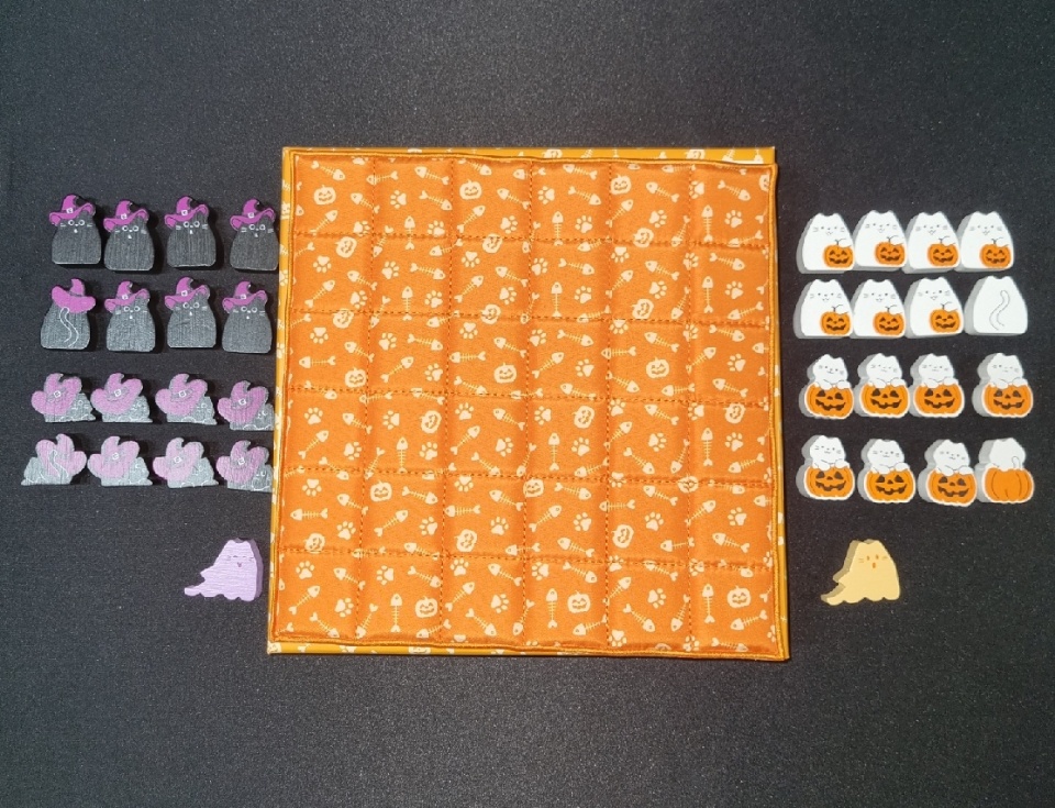 3. 여러분은 보라색 마녀 혹은 주황색 호박 중 한 색상의 아기 고양이 8마리 그리고 유령 고양이 1마리를 가지고 게임을 시작합니다.