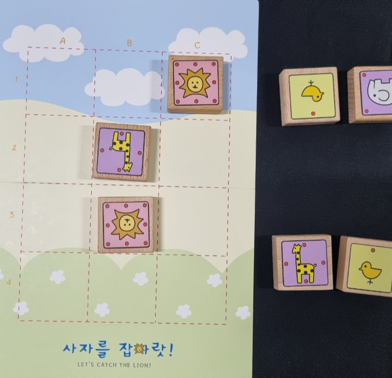동물말 8개(사자 2, 코끼리 2, 기린 2, 병아리 2(앞면: 병아리, 뒷면: 닭)
