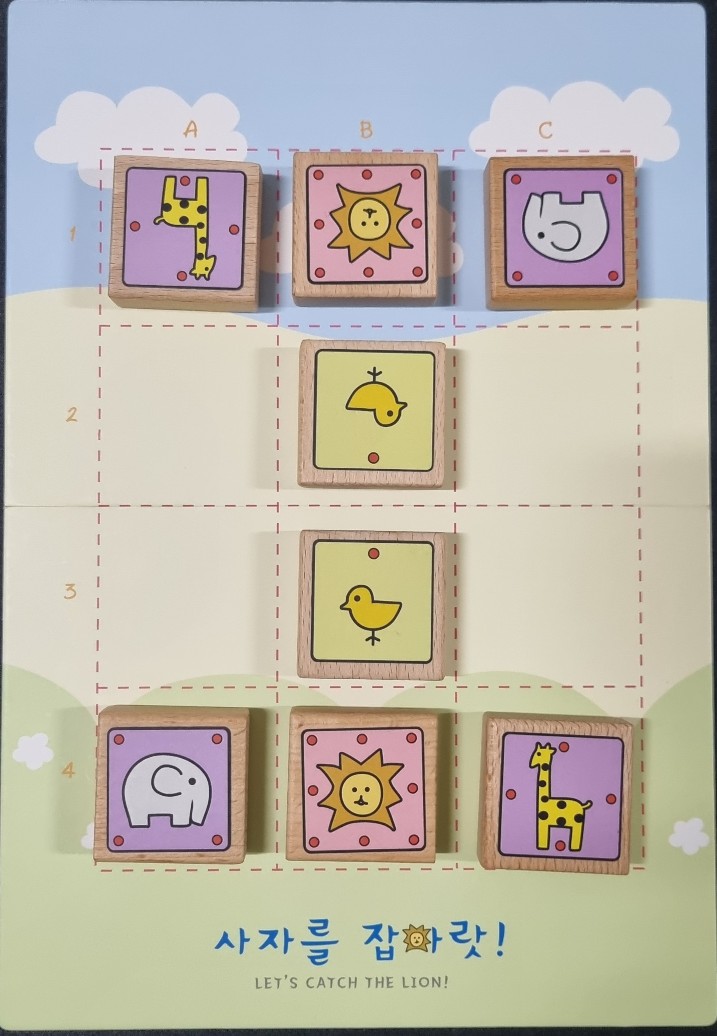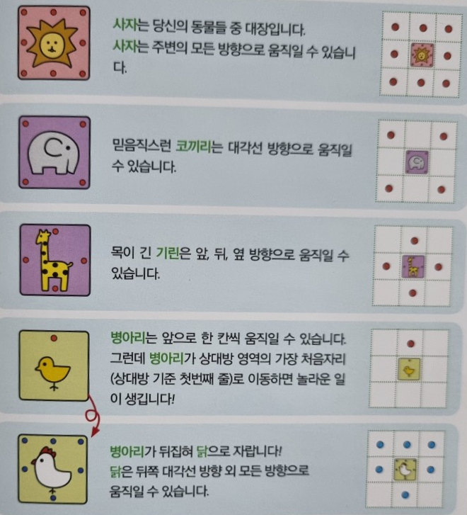 보드판 위에 동물들을 그림과 같이 놓으세요.자신의 앞쪽 세 칸이 자신의 영역이 됩니다.