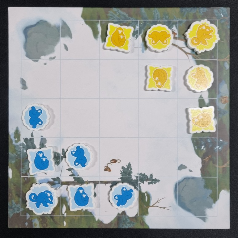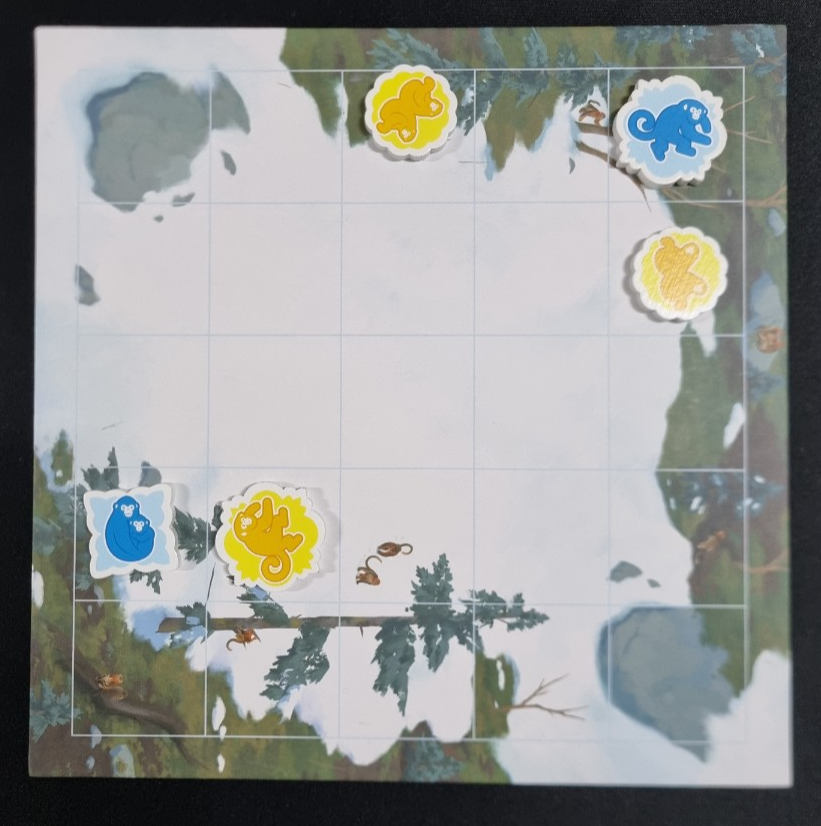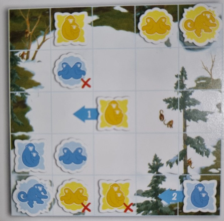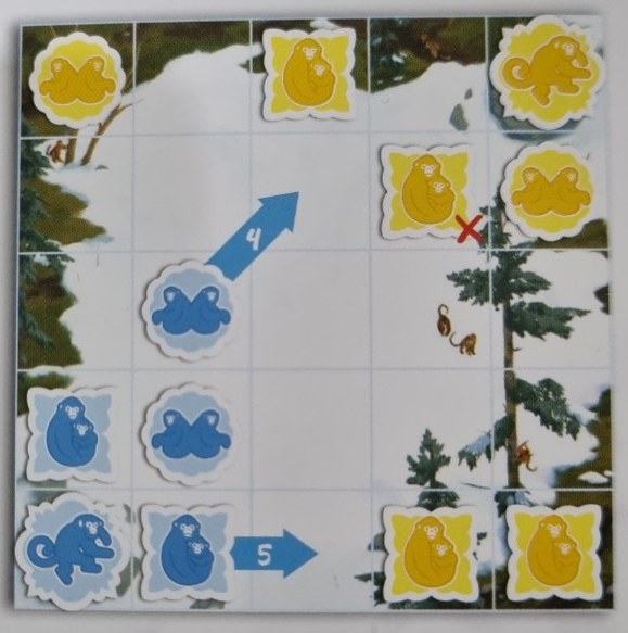 - 자신의 원숭이가 3마리 이상 제거되었고, 자신의 우두머리 수컷이 여전히 시작 지점에 있다면 다음 차례에는 반드시 자신의 우두머리 수컷을 움직여야 합니다.